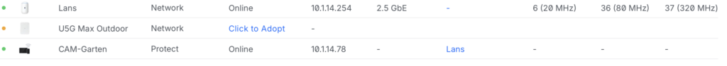 To adopt the U5G-Max we go to “UniFi-Devices” and press “Click to Adopt” on the U5G-Max which should be shown: