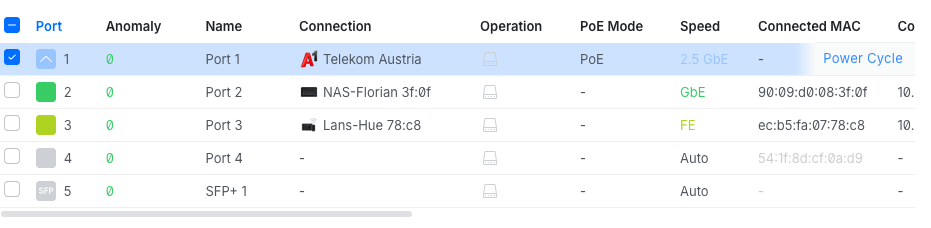 6. As last step we need to restart the U5G-Max that the fix IP-address is applied. We switch to “Ports”, select “Port 1” and than we press “Power Cycle” which disables for a short time the power supply of the network port. Afterwards the U5G will restart and apply the fix IP-address.